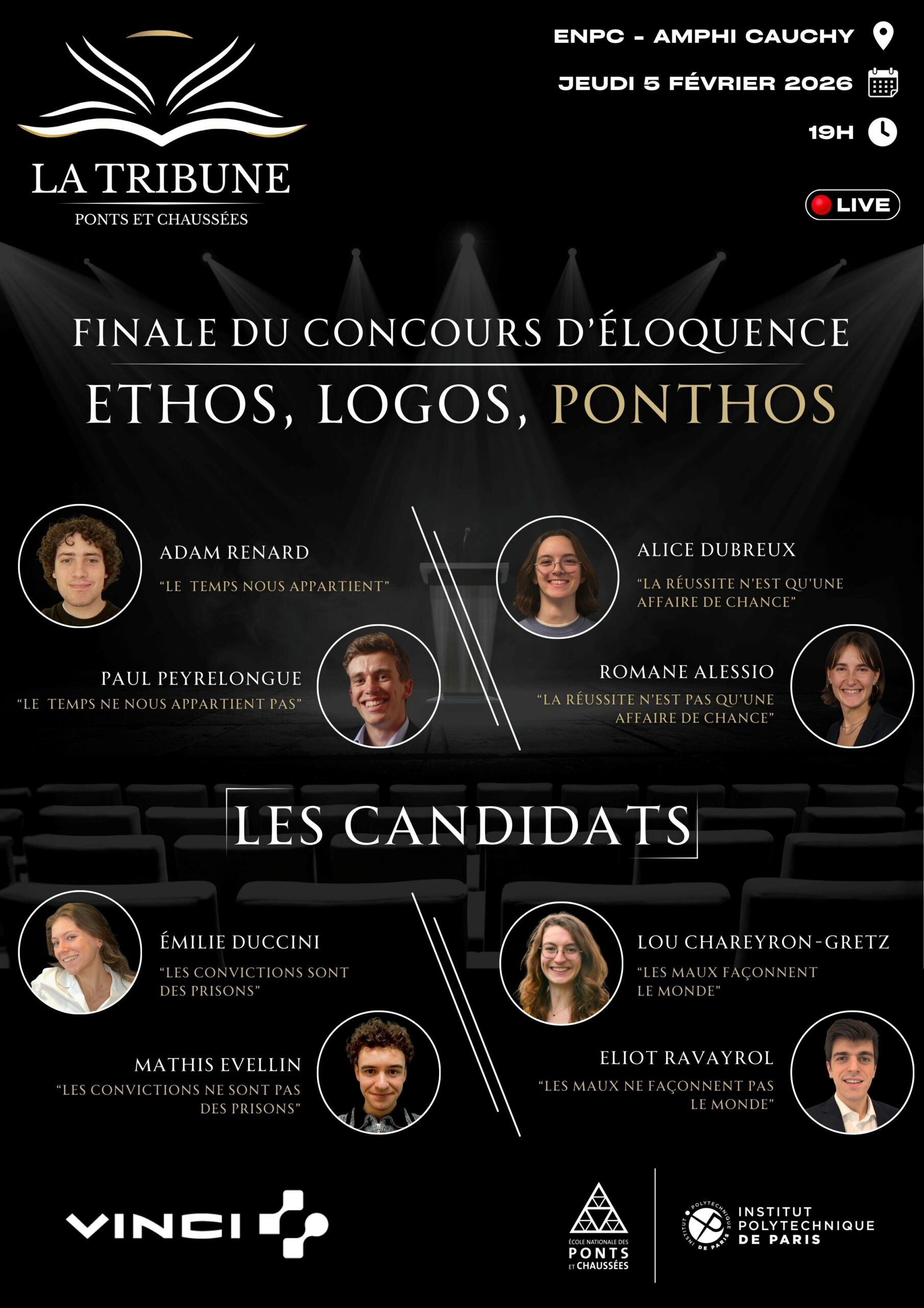 Organisé par La Tribune des Ponts et Chaussées, le concours d’éloquence Ethos, Logos, Ponthos s’est imposé comme un beau rendez-vous de la vie étudiante de École nationale des ponts et chaussées.
