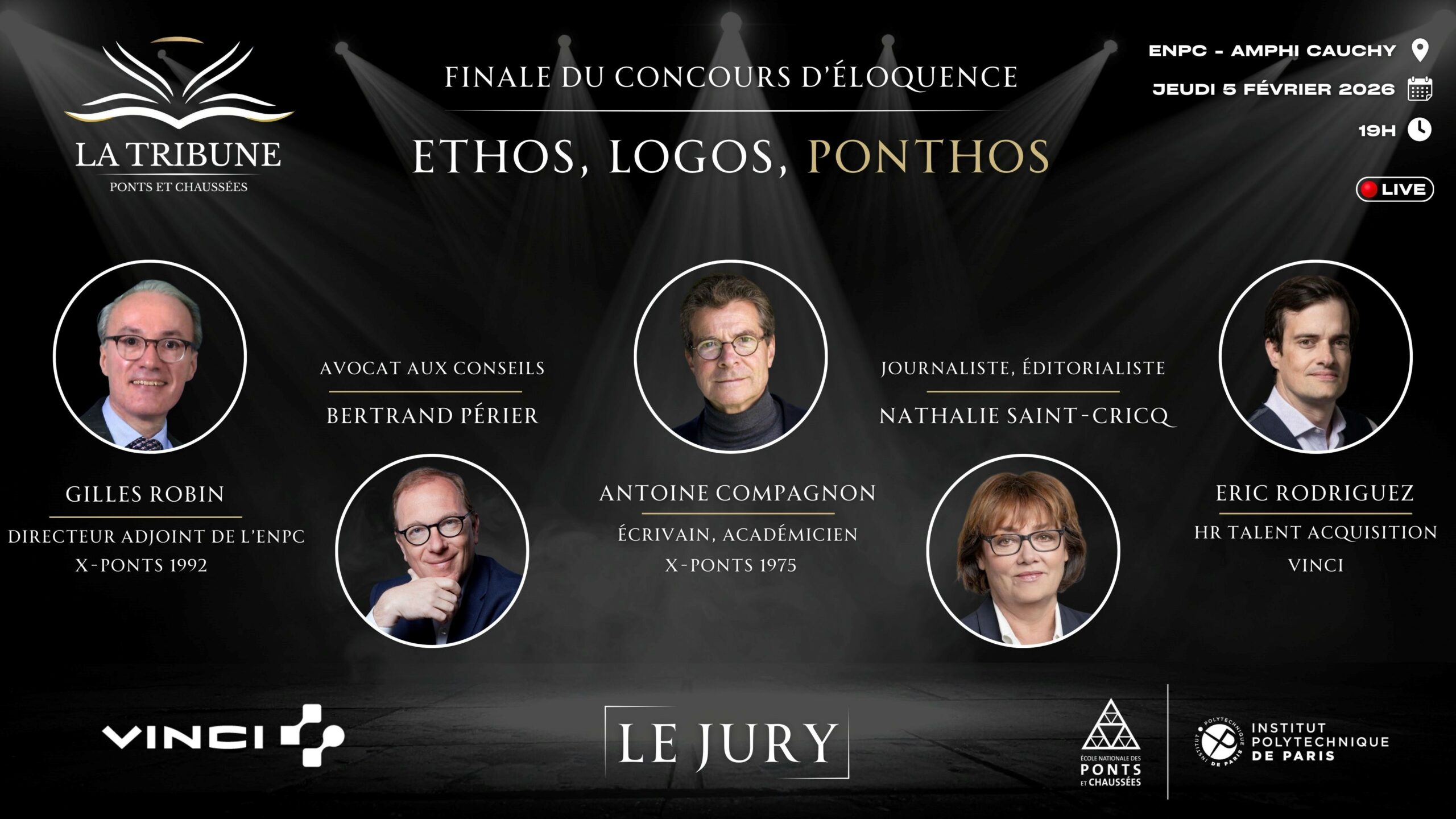 Leurs prestations ont ensuite été évaluées par un jury d’exception réunissant des regards complémentaires : Gilles Robin, directeur adjoint de l’École (X-Ponts 1992), Antoine Compagnon, écrivain et académicien (X-Ponts 1975), Nathalie Saint-Cricq, journaliste et éditorialiste reconnue, Bertrand Périer, avocat aux Conseils et spécialiste de l’art oratoire, ainsi que Eric Rodriguez, représentant de VINCI en charge du recrutement des talents.