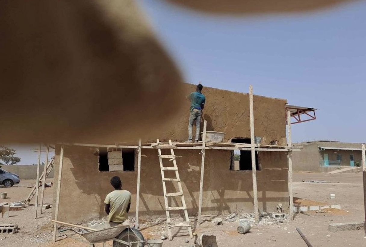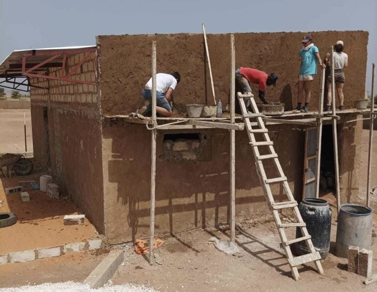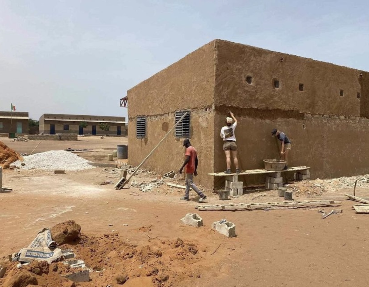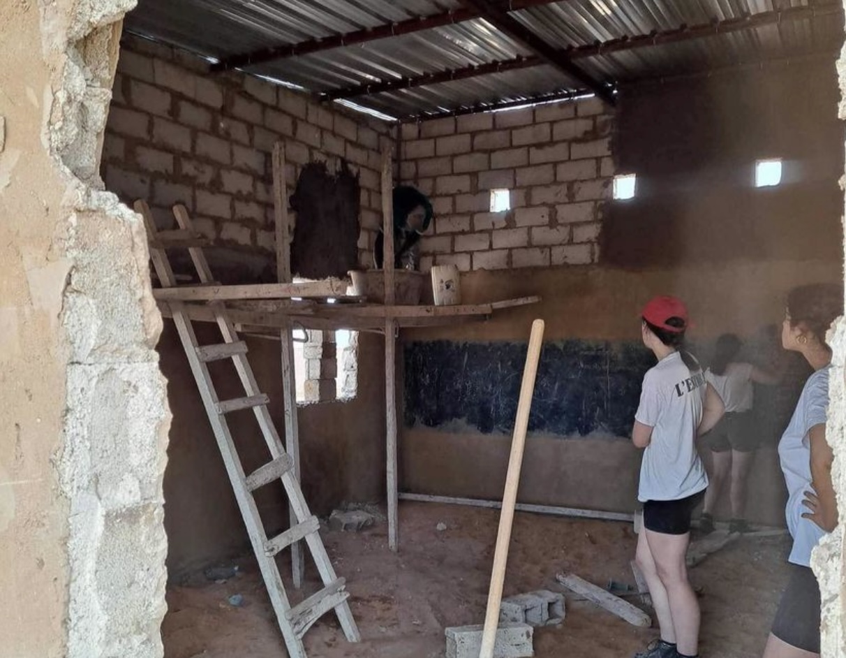 En raison de l’emplacement inondable, les étudiants ont dû remplir des brouettes de sable pour le remblai des salles de classe et ont également participé à la création des fondations d’une terrasse, qu’ils ont remplie de terre eux-mêmes. Ensuite, ils ont entrepris la phase du crépi intérieur et extérieur en utilisant des truelles, en apprenant auprès de maçons locaux. Ils ont également posé le toit en tôle et la plupart des ouvertures, en utilisant des burins et des marteaux. En travaillant progressivement sur les murs extérieurs et intérieurs, en montant et démontant les échafaudages, les élèves ont contribué à achever le crépi.»