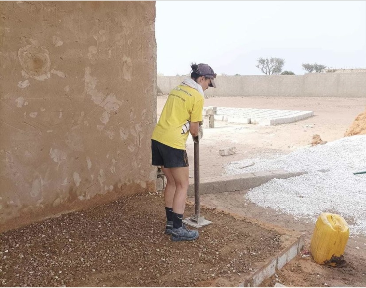 «Après la collecte de fonds, les étudiants sont partis au Sénégal avec Élisabeth Beyls de l’administration de l’école pour aider à construire les salles de classe. Ils ont été rapidement impliqués par le chef de chantier, brisant les barrières culturelles et linguistiques. Au début, ils ont travaillé sur le rehaussement des quatre murs en raison de l’inondabilité de l’endroit. Cela a impliqué la création de piliers en béton avec une armature en métal, principalement réalisée par les étudiants en pliant et assemblant les tiges d’acier, ainsi que la fabrication des parpaings nécessaires pour démonter les murs existants. Les élèves ont également participé à l’application de l’enduit sur les parpaings.
